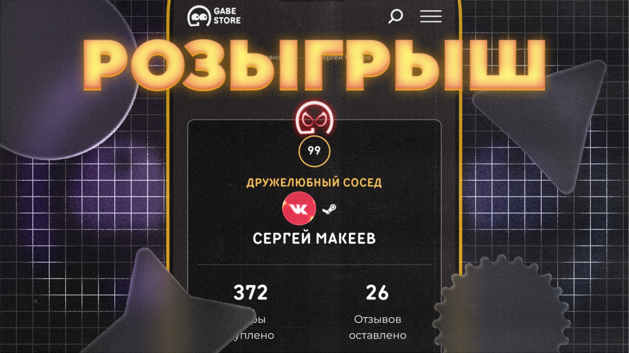 У нашего сайта много крутых фишек, и одна из них — отображение вашего профиля ВК на GabeStore. Пользуетесь или хотите воспользоваться этой фичей? Тогда у вас есть шанс выиграть игру до 1500 рублей! Итак, для участия в розыгрыше: