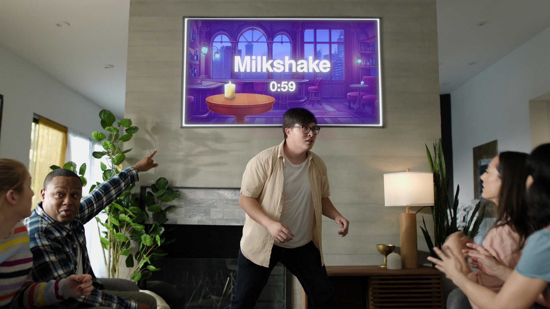 Если во многих подобных проектах игрокам нужны мобильные телефоны, то тут вы сможете обойтись и без них. Соперники удобно располагаются на диване перед телеком, поочерёдно встают к нему спиной и пытаются понять, что за слово светится на экране. Помогать им придётся как стандартным способом, так и с условиями — например, используя смешной акцент или придумывая сценки. На всё про всё одна минута, поэтому действовать надо быстро!